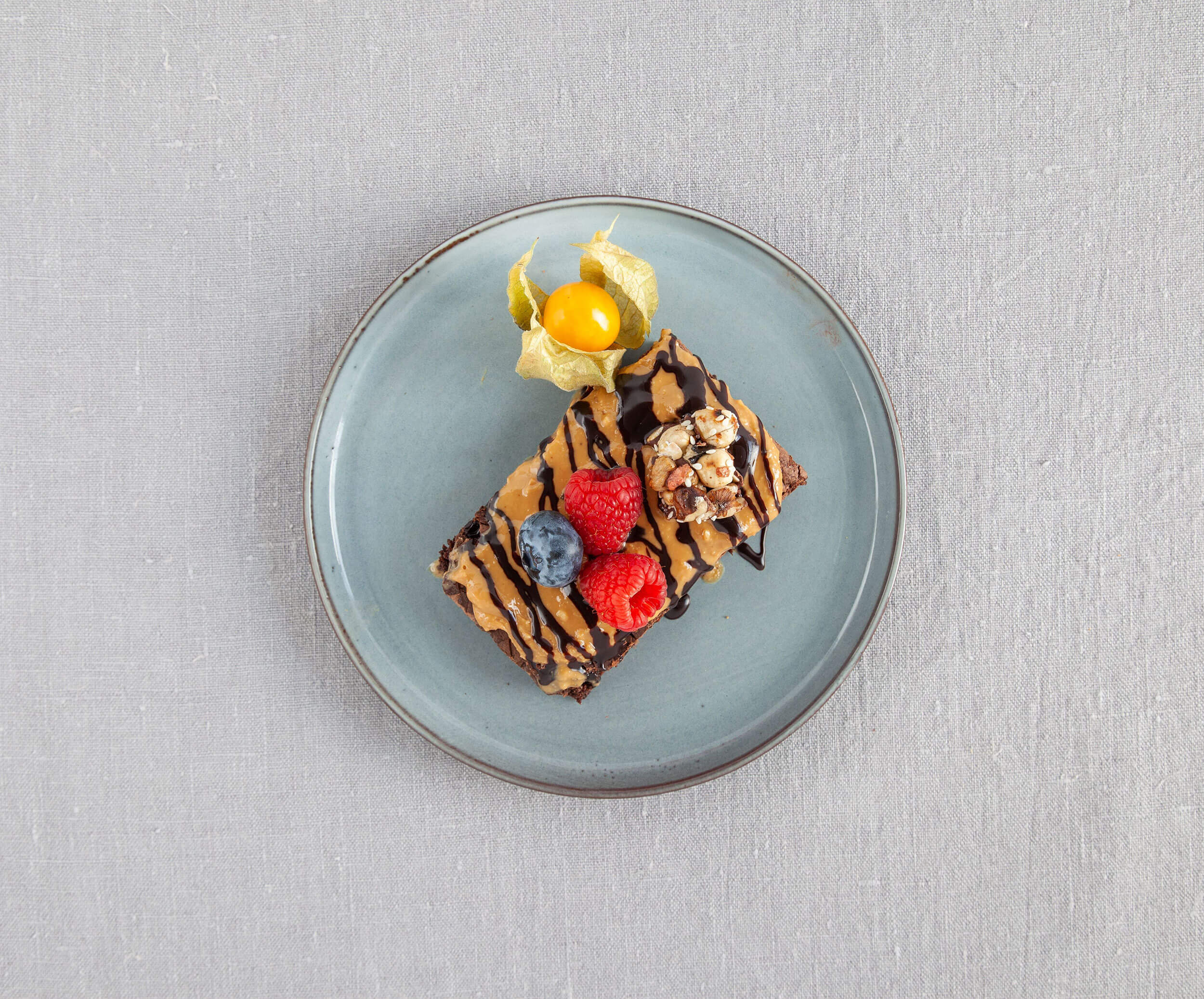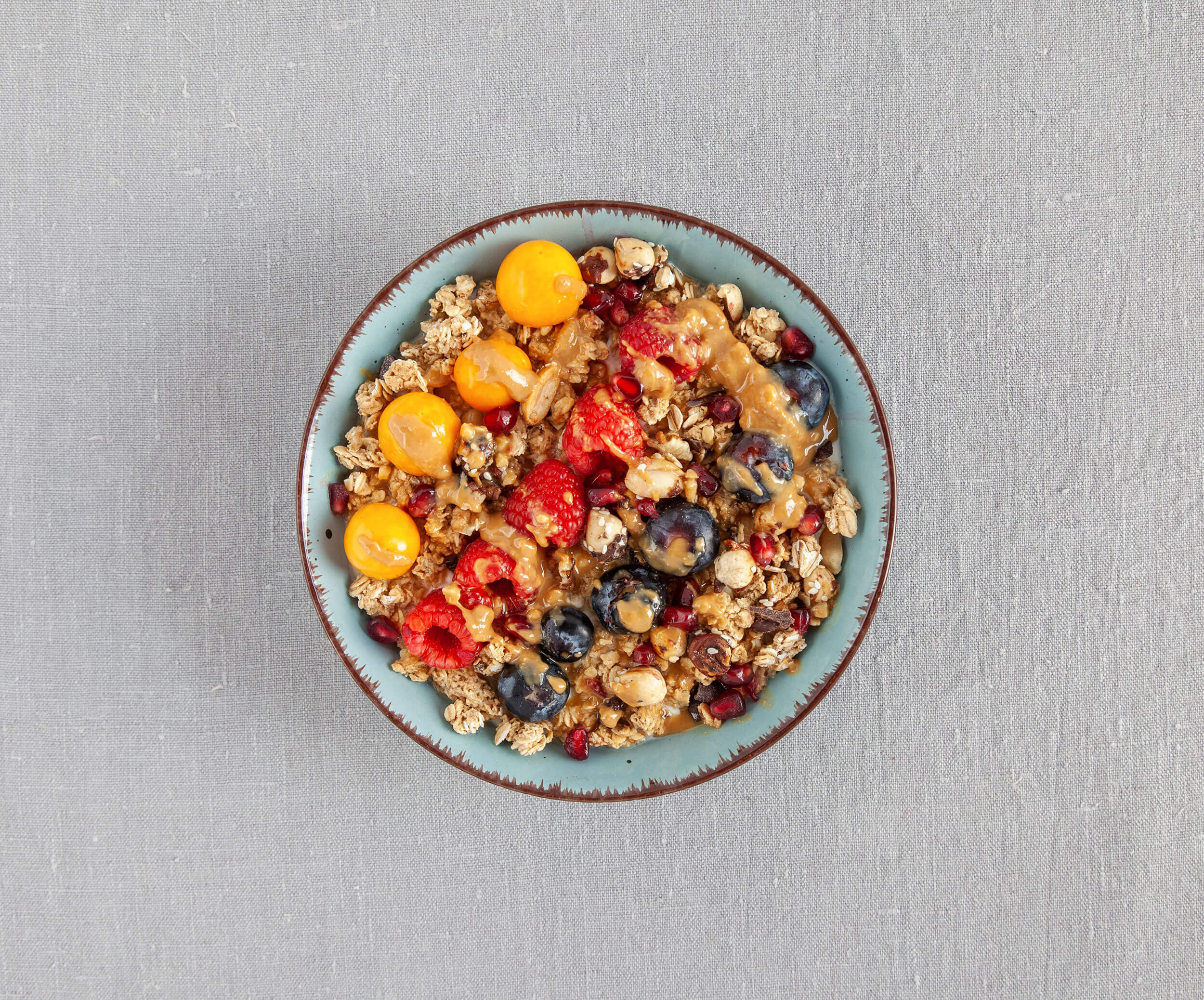 mit frischen Beeren, Joghurt, Peanut Butter Drizzle