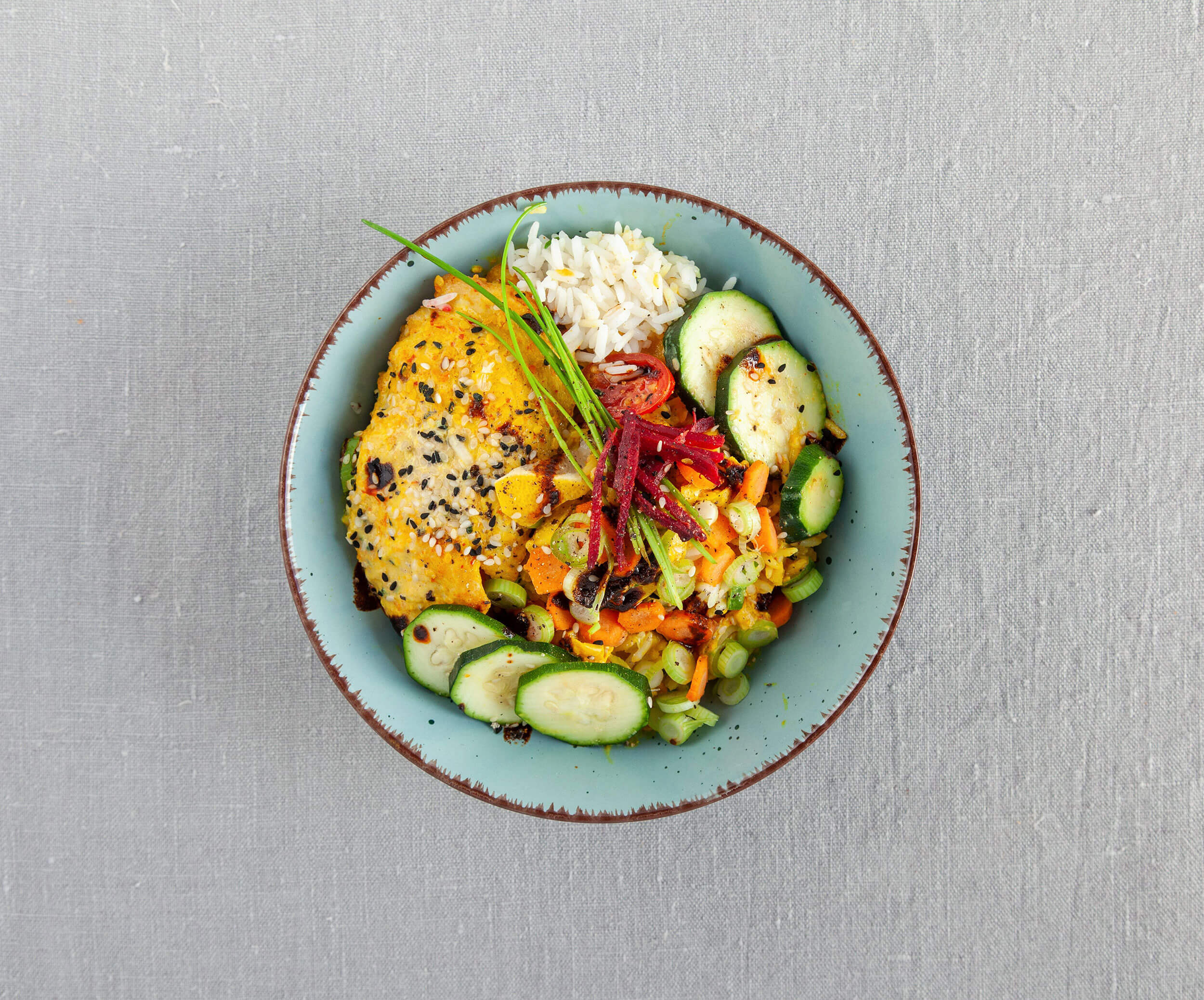 Frisches, knackiges Gemüse, Hühnerbrust mit Reis in einer Bowl serviert. Tolle Gewürze und Öle runden dieses Gericht ab. Gerne auch vegan und vegetarisch bestellbar.