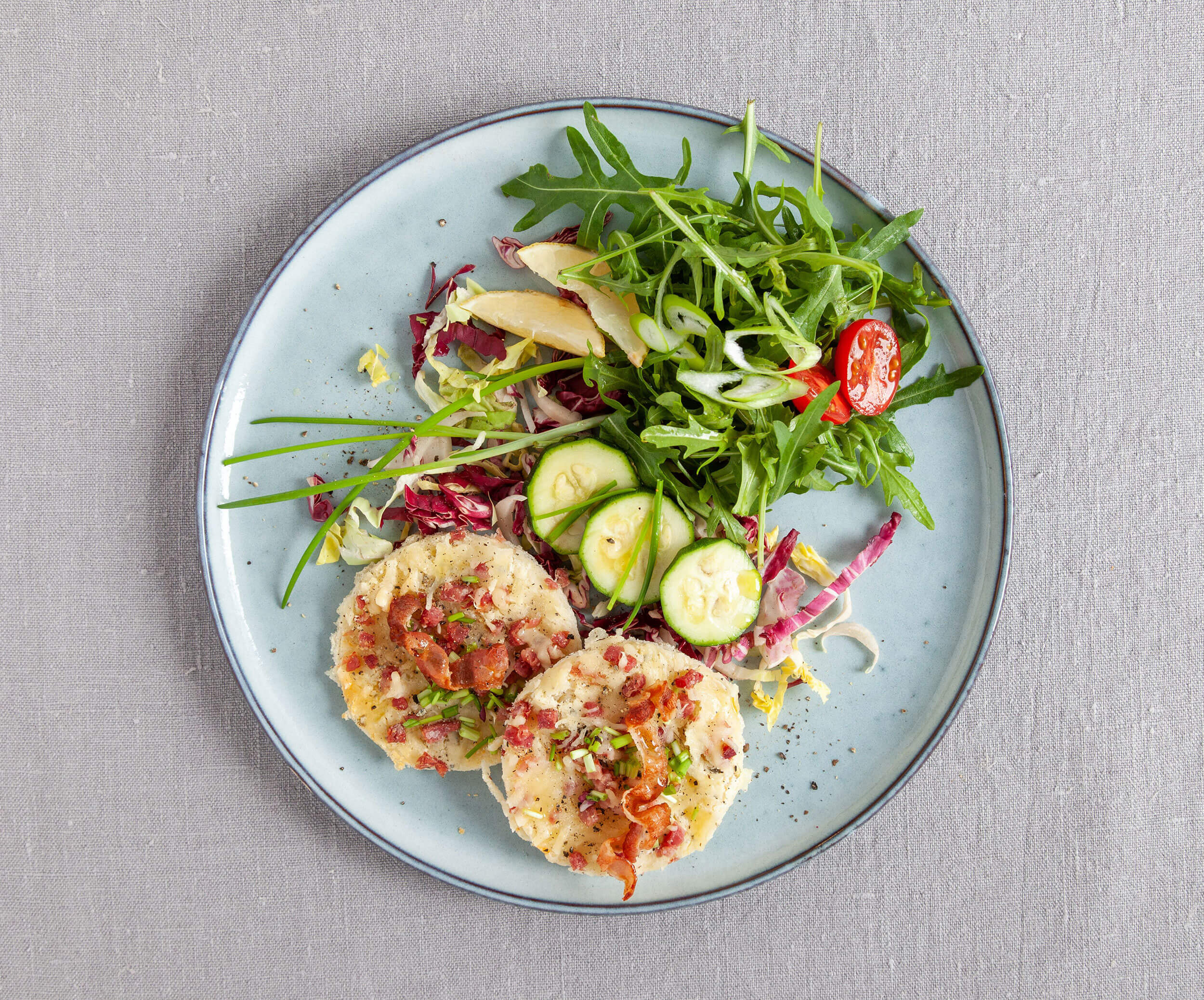 mit Speck, Zwiebeln und Käse. In drei verschiedenen Größen erhältlich: Als Fingerfood, Vorspeise und Hauptspeise zu bestellen.