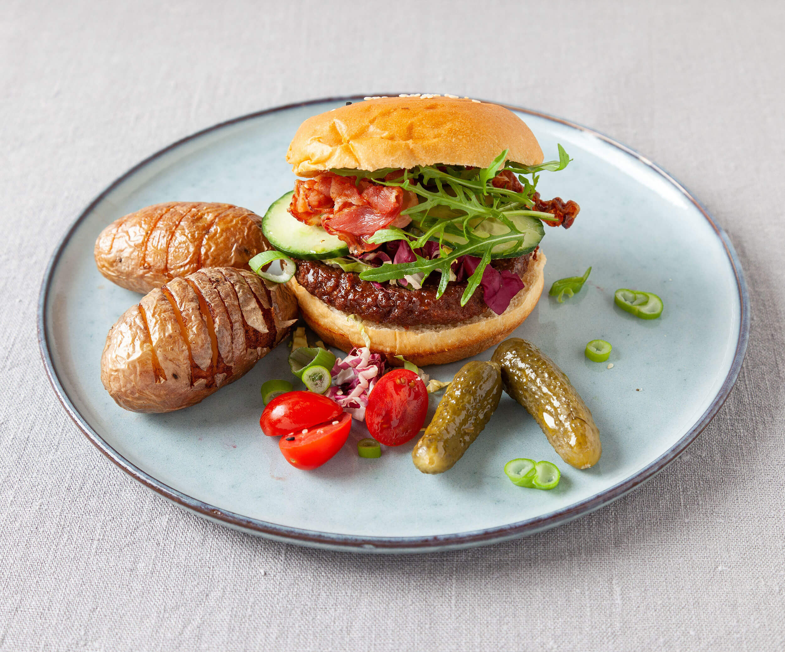 mit einem Brioche Bun, frischen Tomaten, Salat, Zwiebeln, Gürkchen und hausgemachte Sauce. Sehr gerne auch vegan und vegetarisch.
